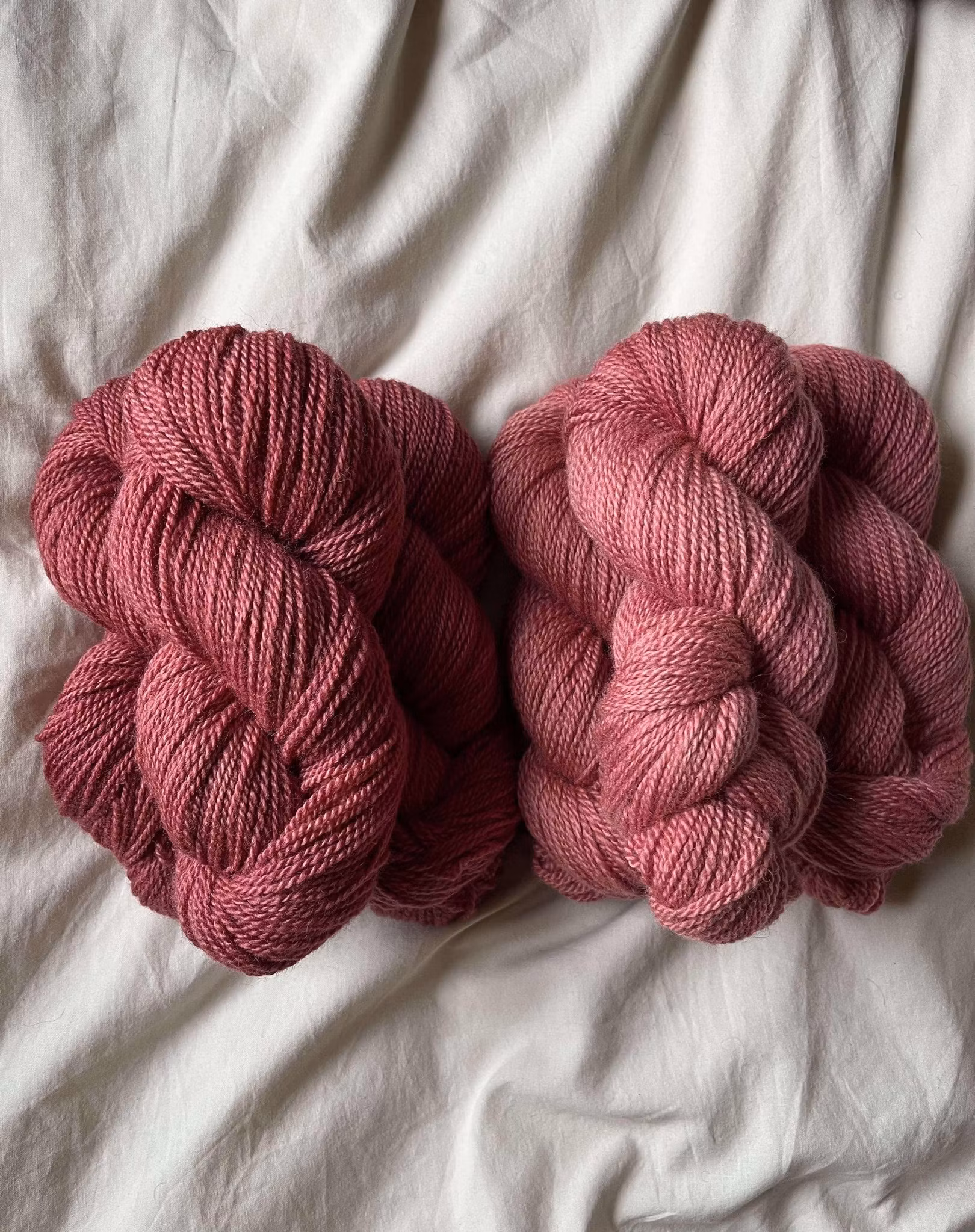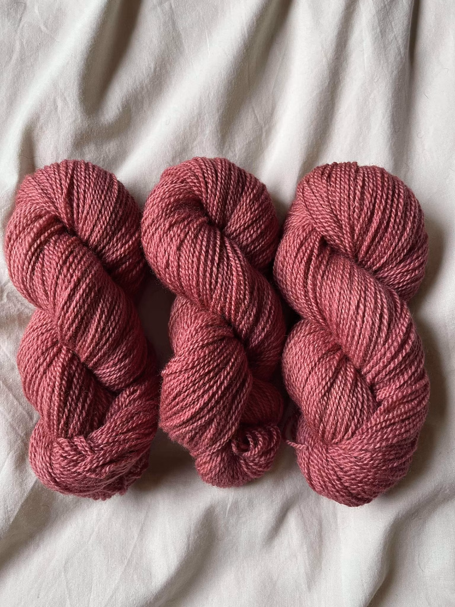 Rosa garn färgat på 100 % vit jämtlandsull. Syns till vänster på bild nr 2.