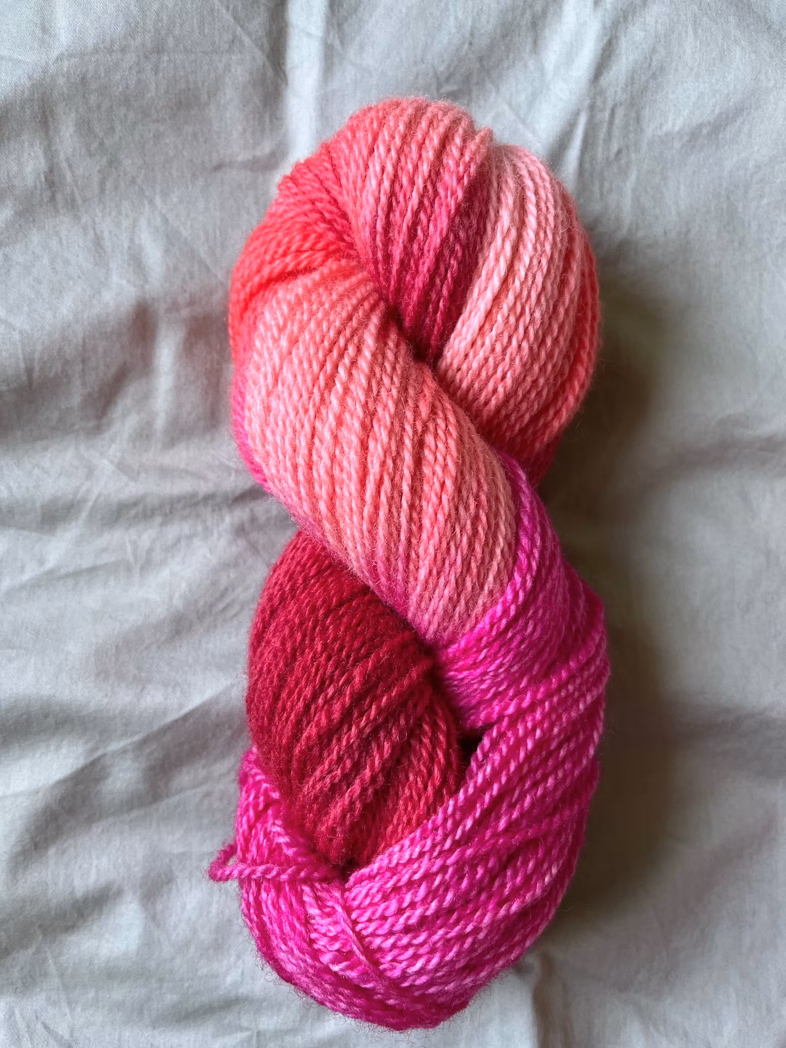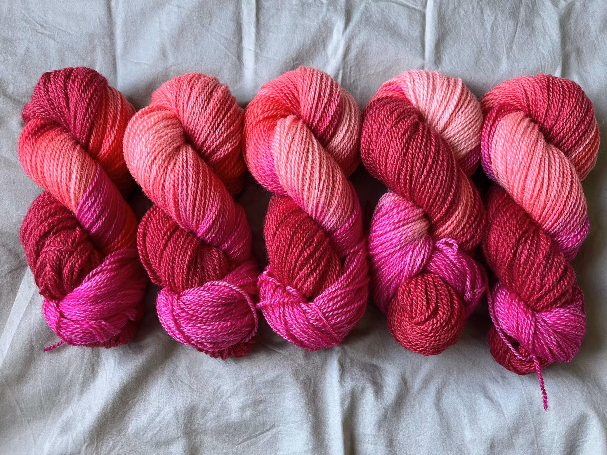 Garn i rött, rosa och korall färgat på 100 % vit jämtlandsull.