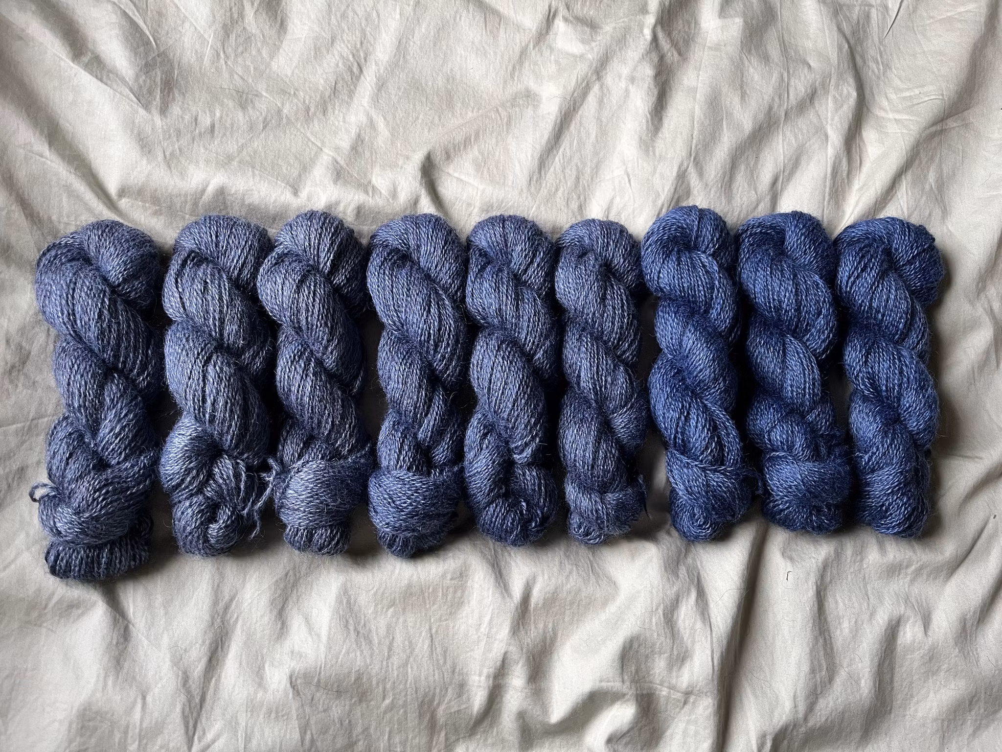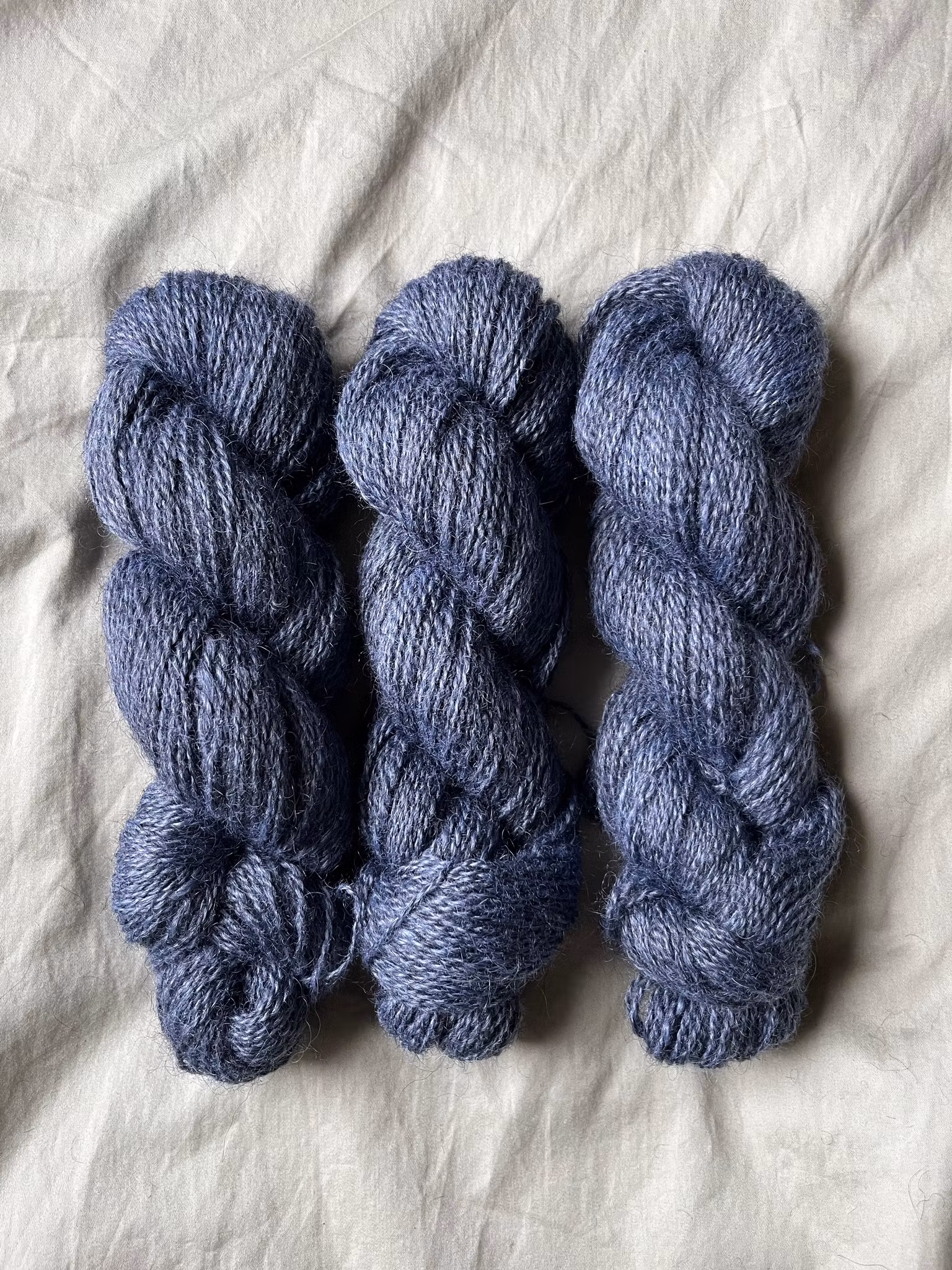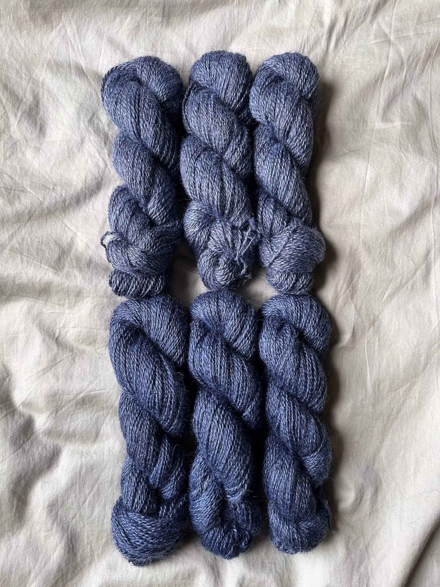 Blågrått garn färgat på 90 % gråmelerad gotlandsull och 10 % vit finull. Syns högst upp på bild nr 2 och längst till vänster på bild nr 3.