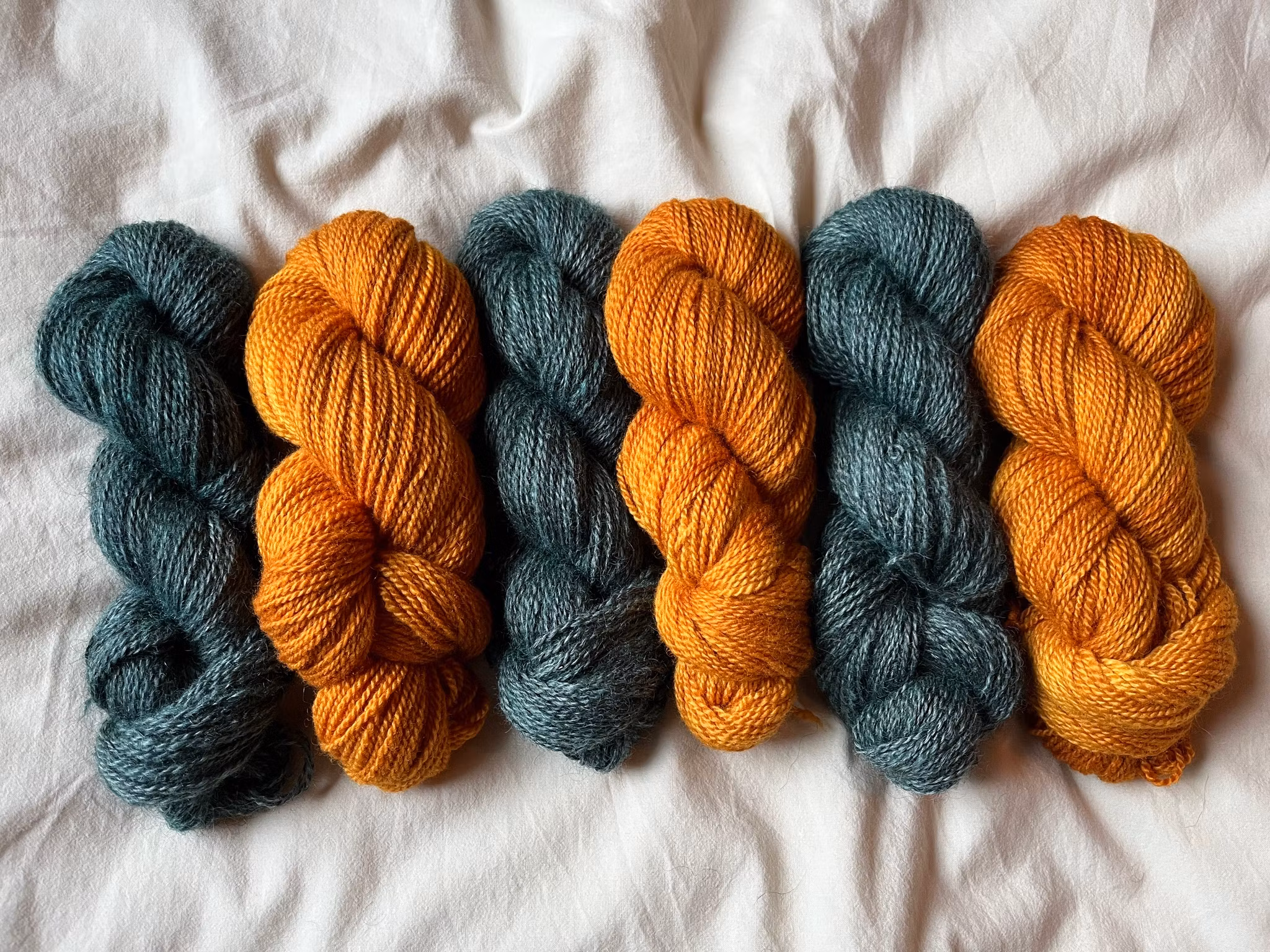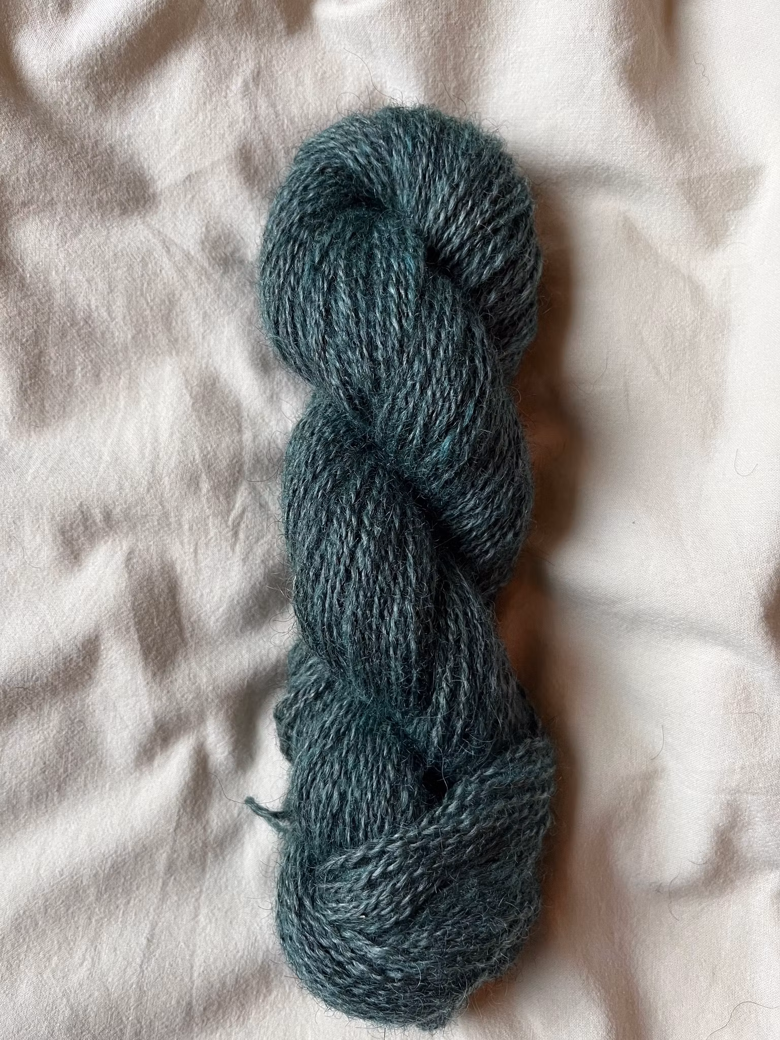 Blågrönt garn färgat på 90 % gråmelerad gotlandsull och 10 % vit finull. På bild nr 3 tillsammans med Jämtlandsull i färgen Guldsmycket.