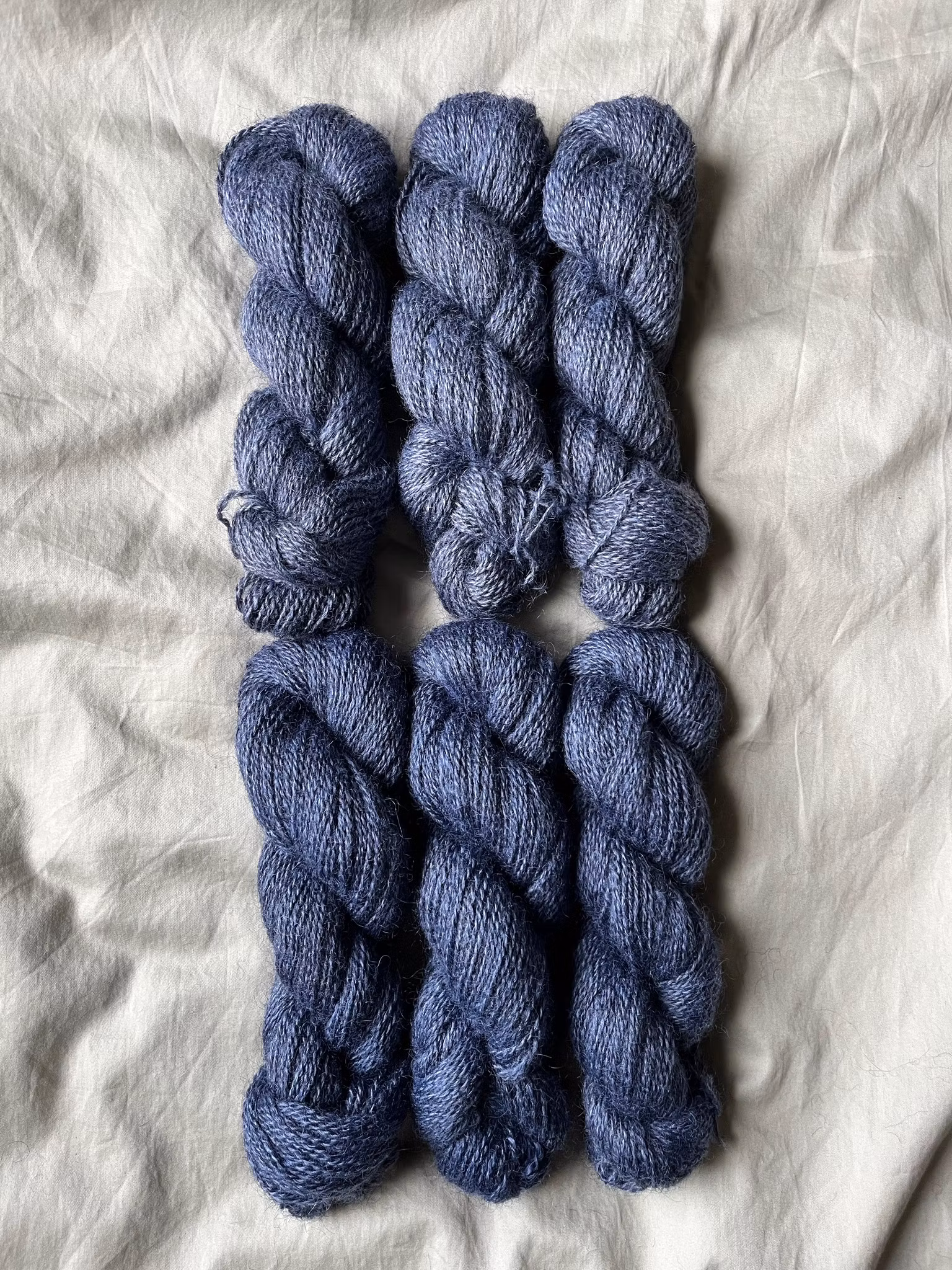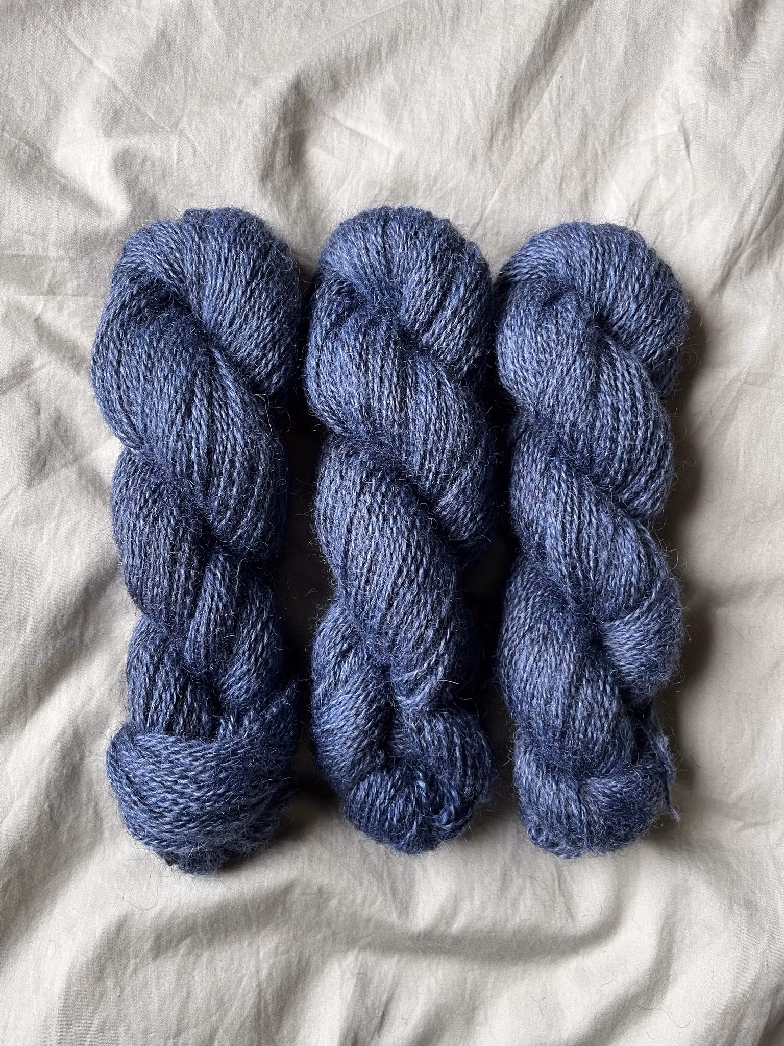 Blågrått garn färgat på 90 % gråmelerad gotlandsull och 10 % vit finull. Syns längst ner på bild nr 2 och i mitten på bild nr 3.