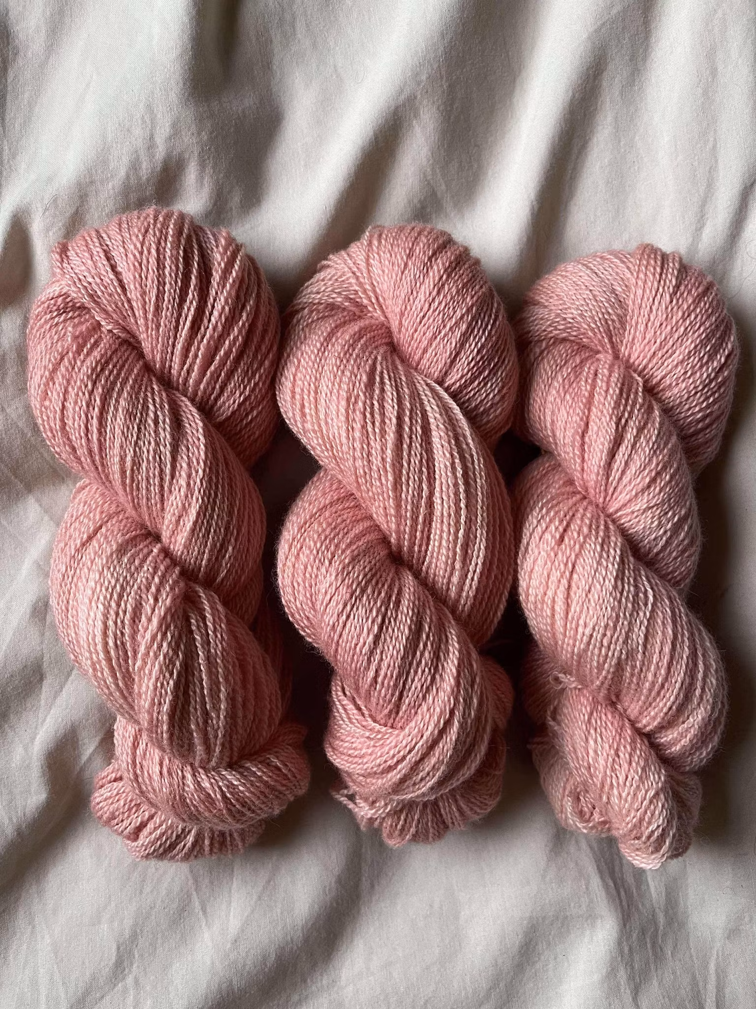 Rosa garn färgat på 100 % vit finull. Syns till höger på bild nr 2.