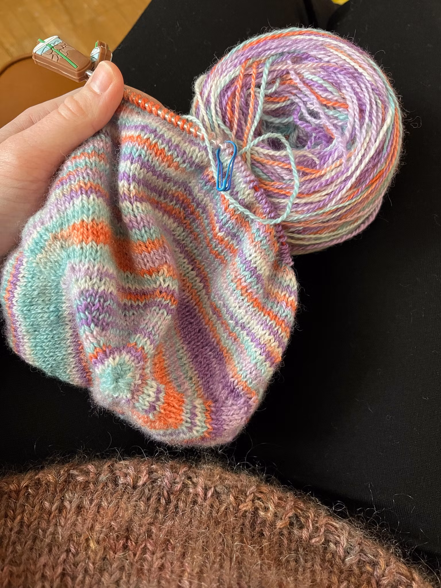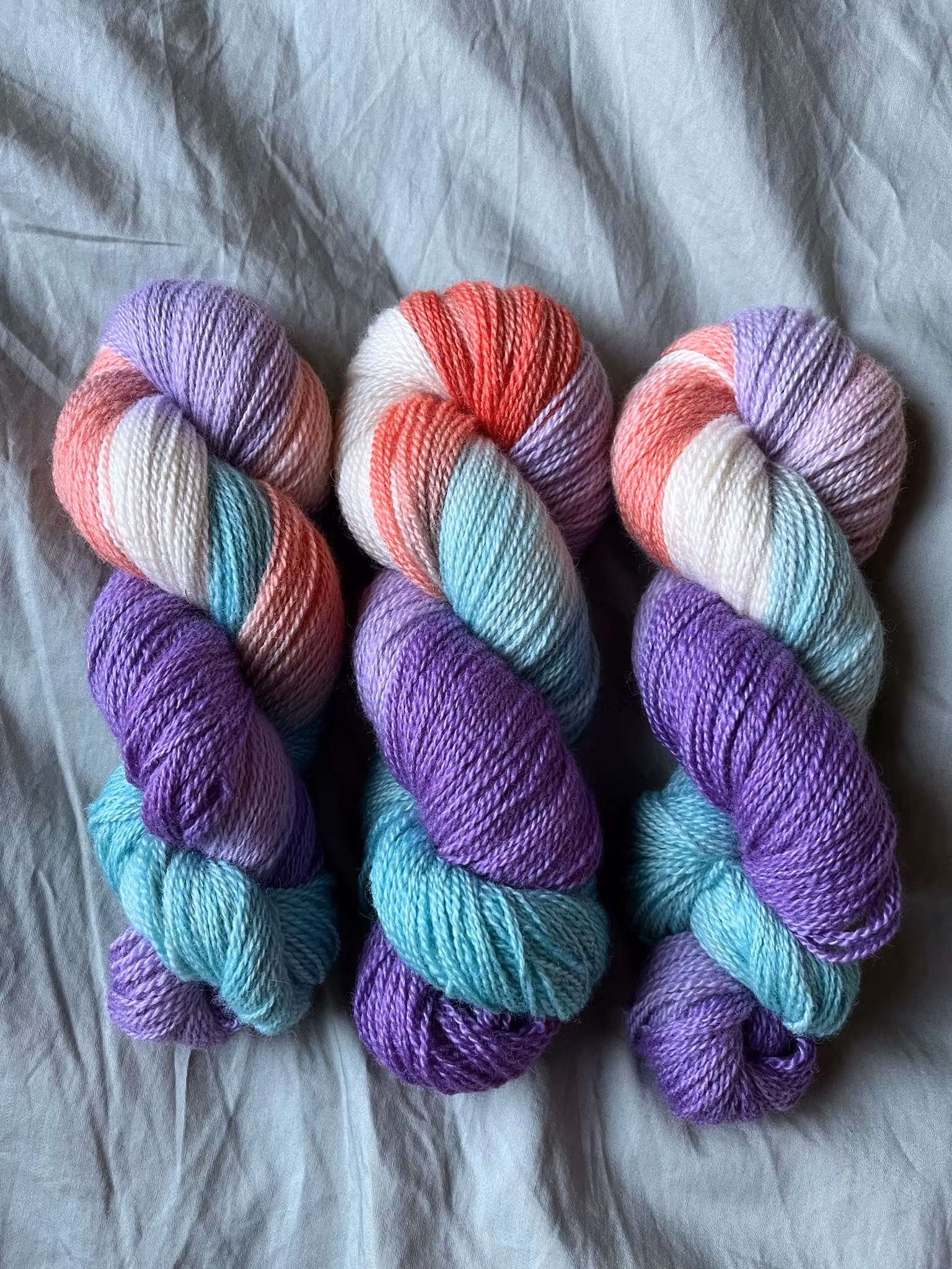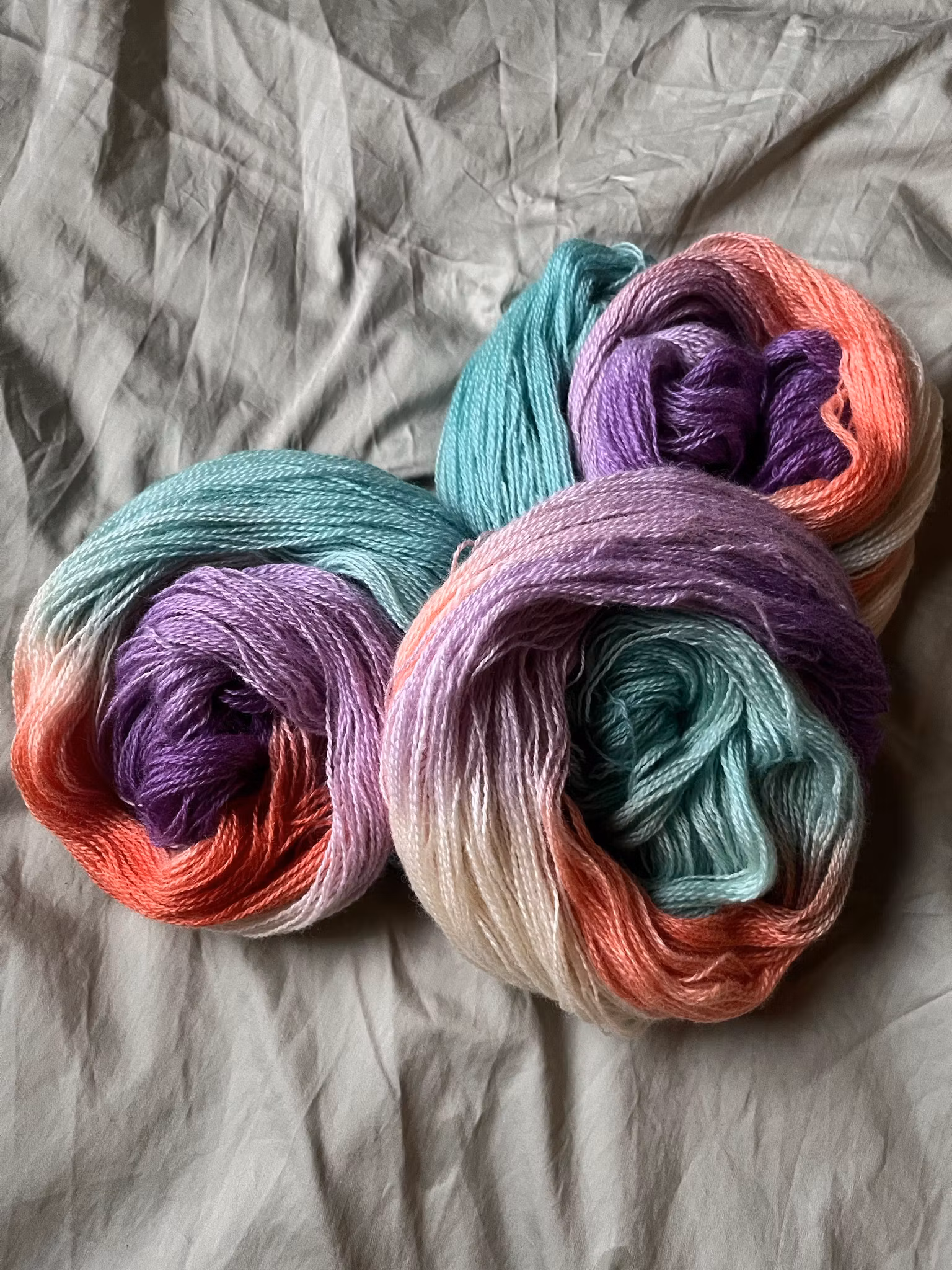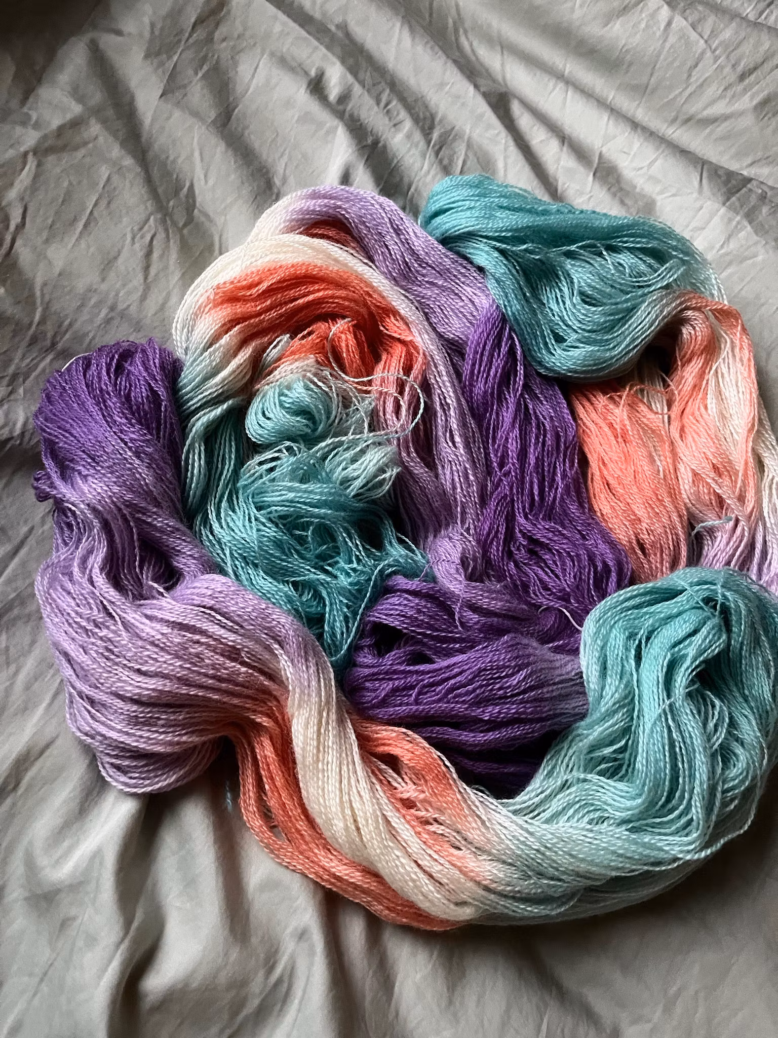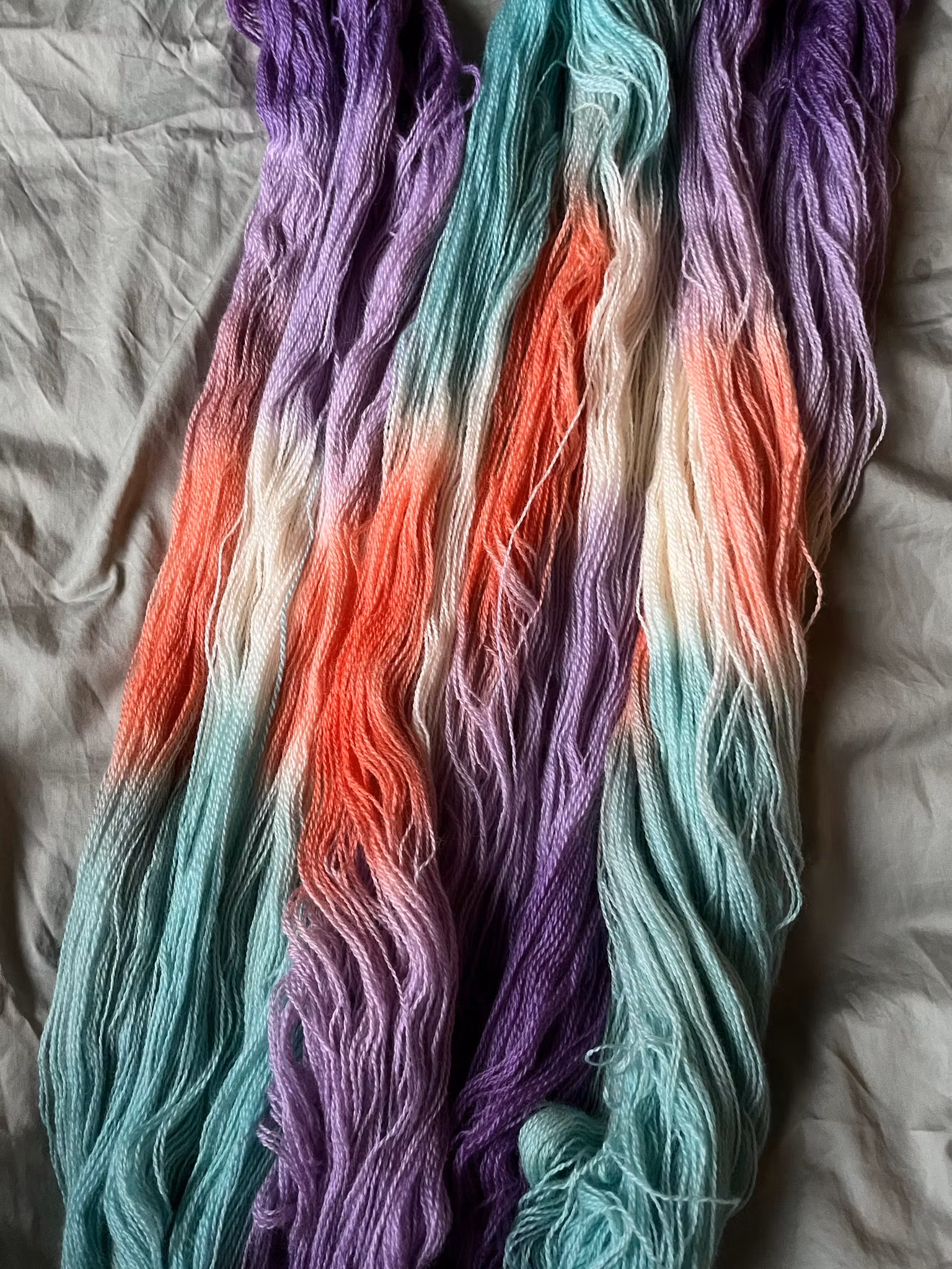Flerfärgat garn i lila, orange, mintgrönt och vitt färgat på 100 % vit finull.