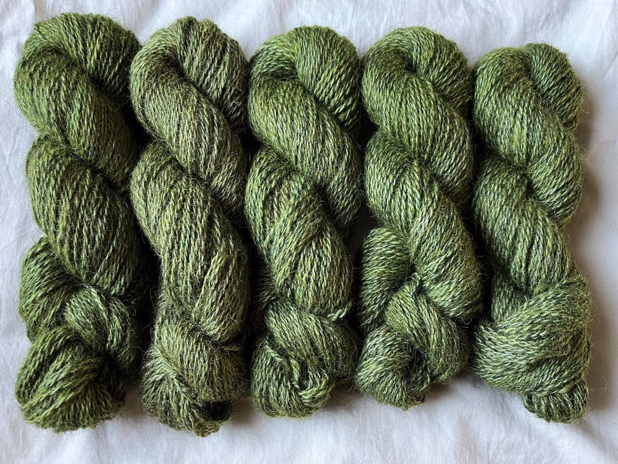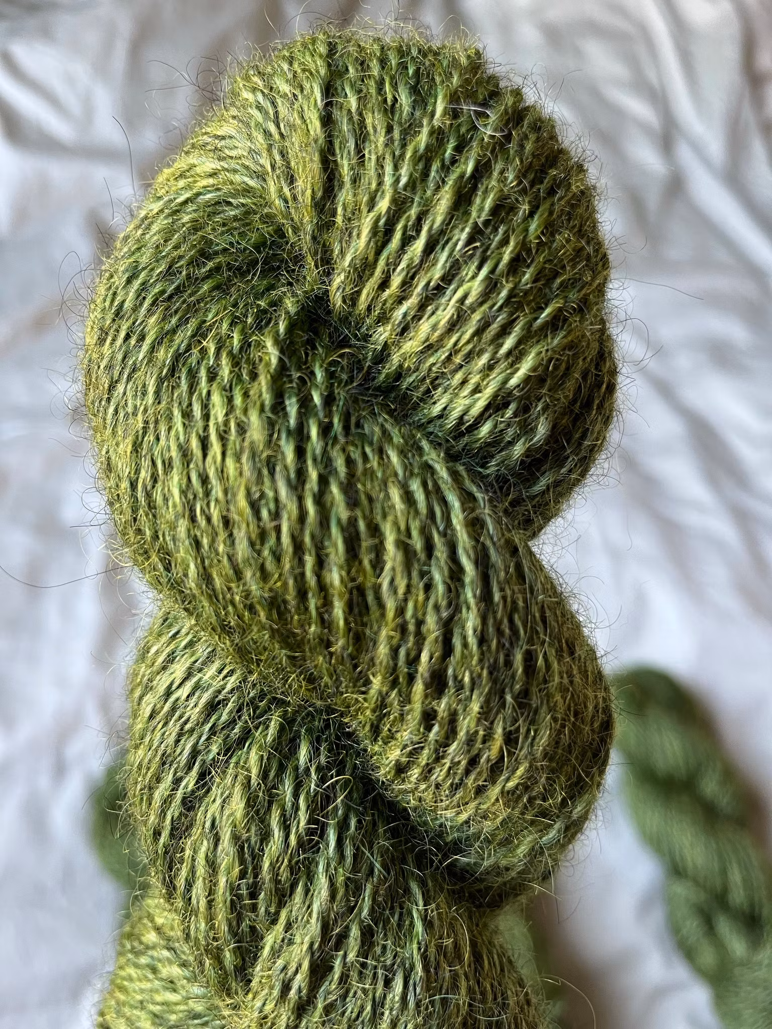 Grönt garn färgat på 90 % gråmelerad gotlandsull och 10 % vit finull.