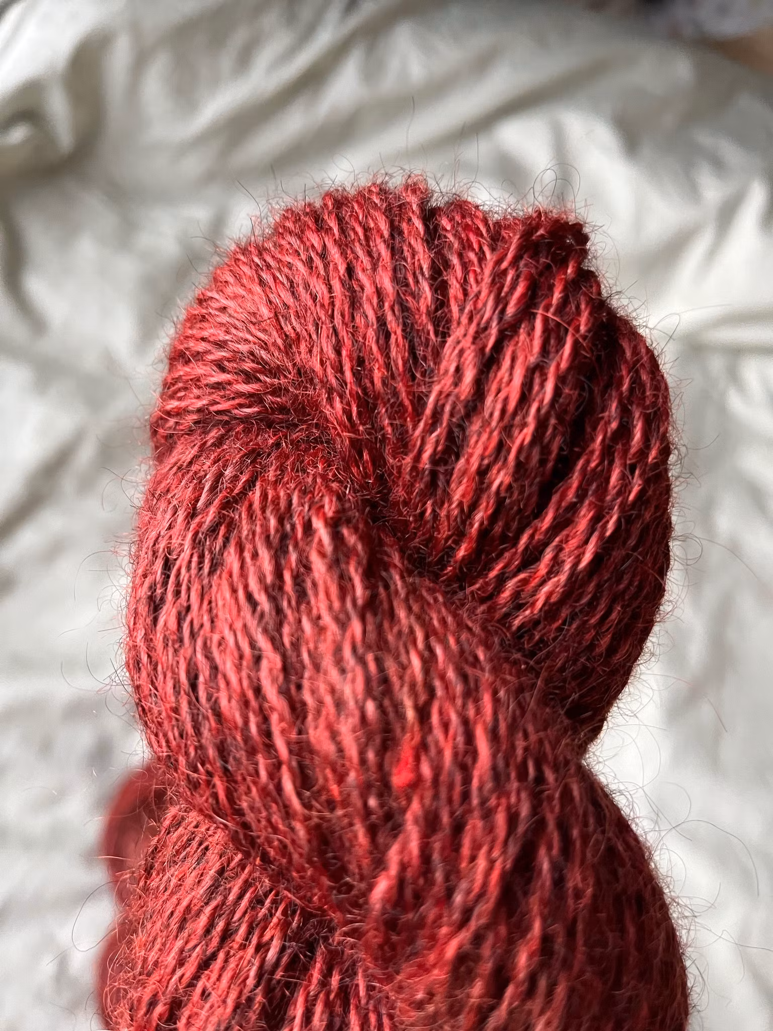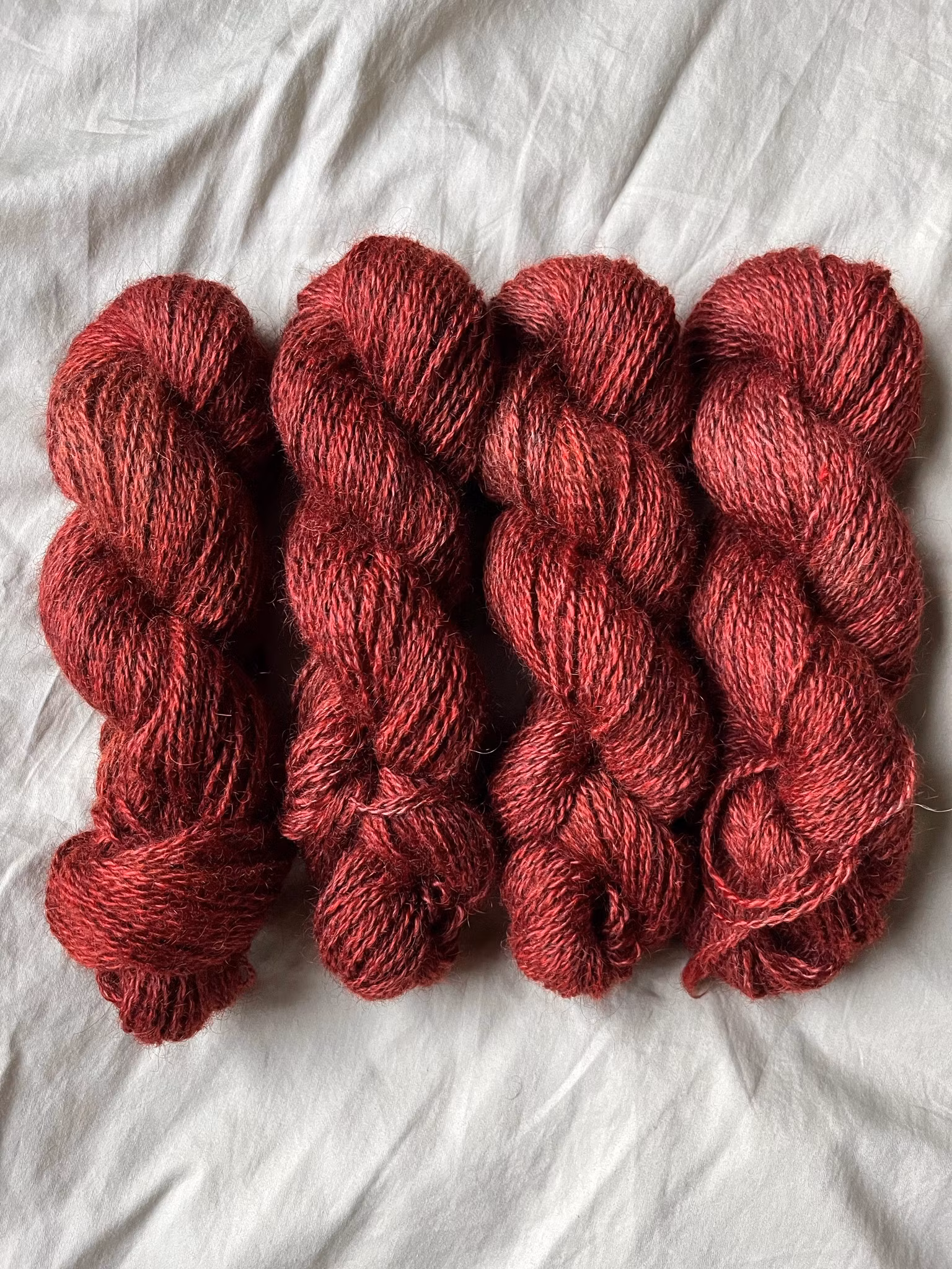 Rött garn färgat på 90 % gråmelerad gotlandsull och 10 % vit finull.
