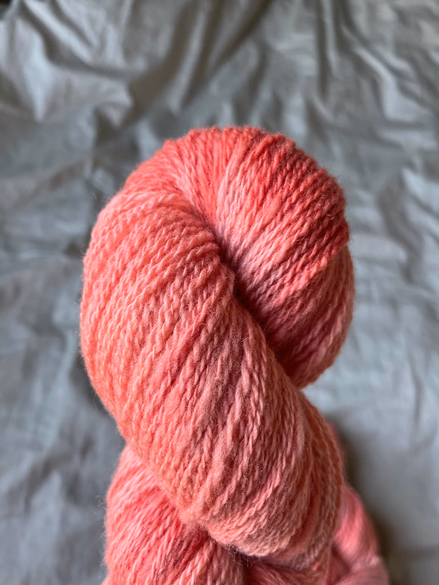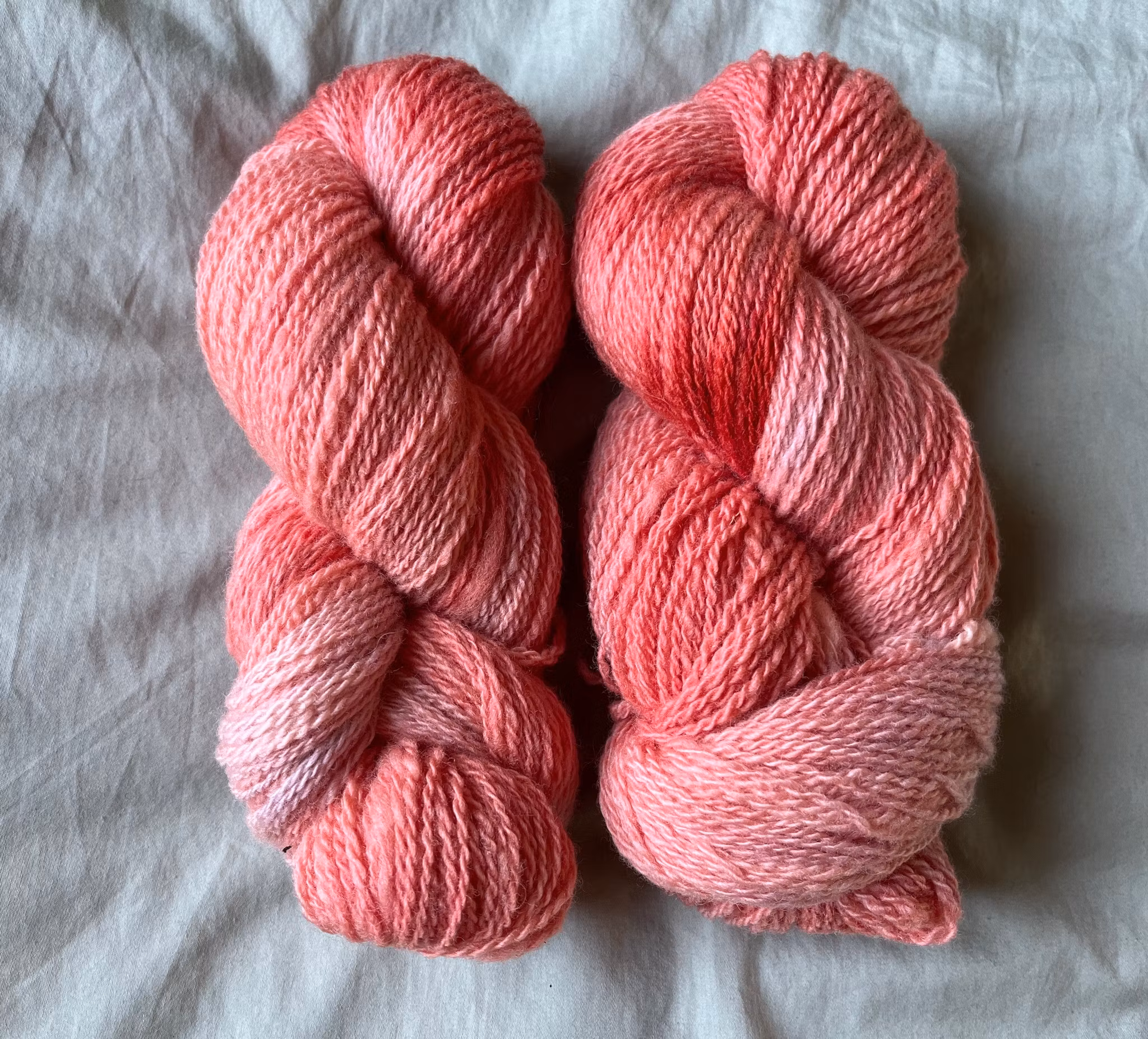 Korallrosa och lila garn färgat på 100 % vit jämtlandsull.
