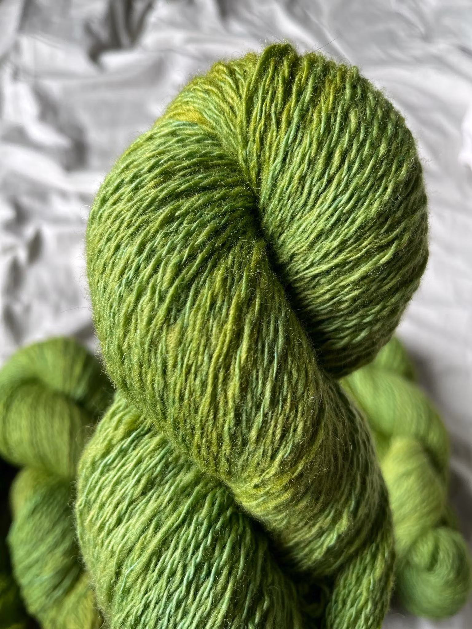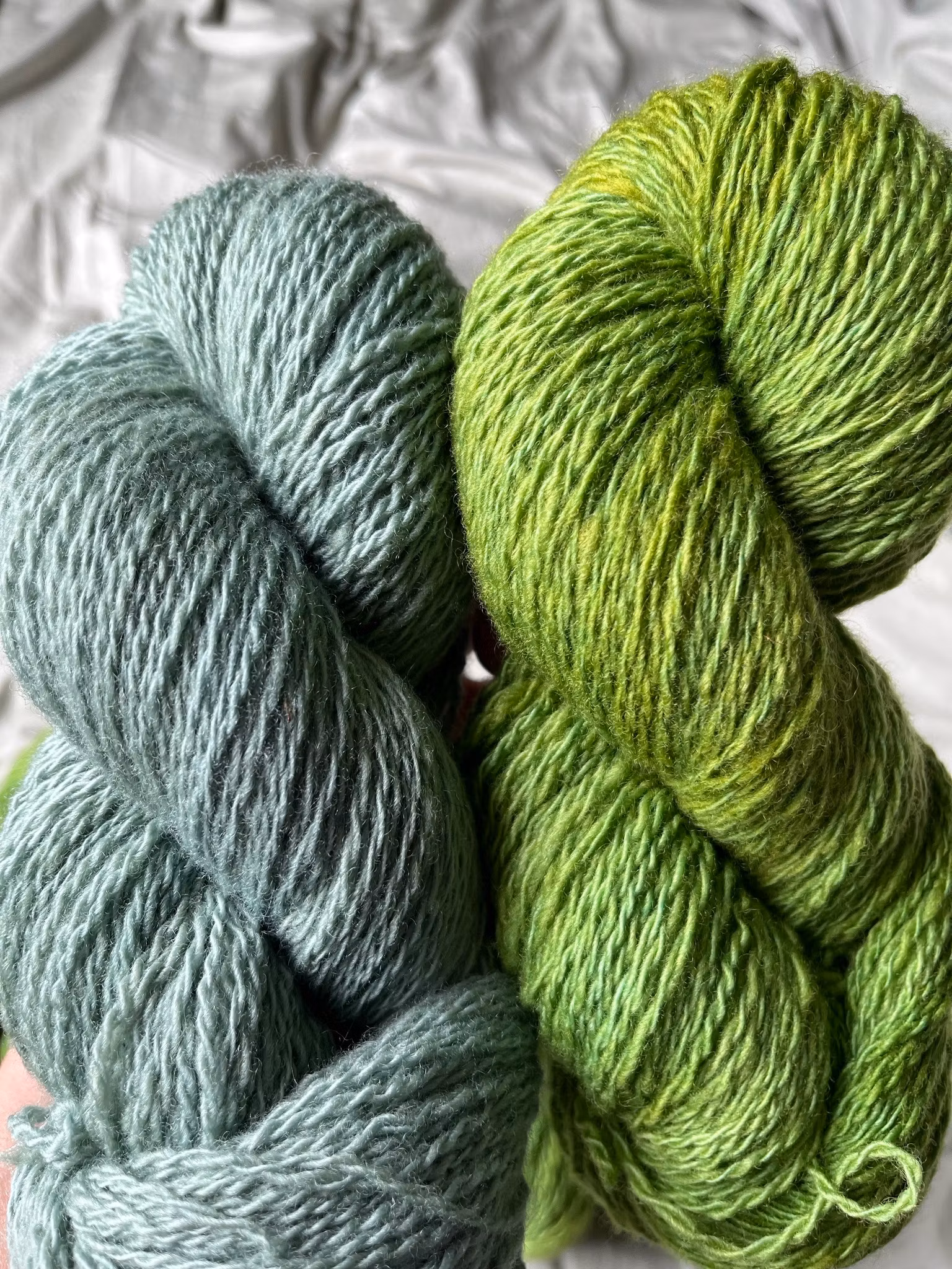 Grönt garn färgat på 100 % vit jämtlandsull. På bild nr 3 tillsammans med Salvia.