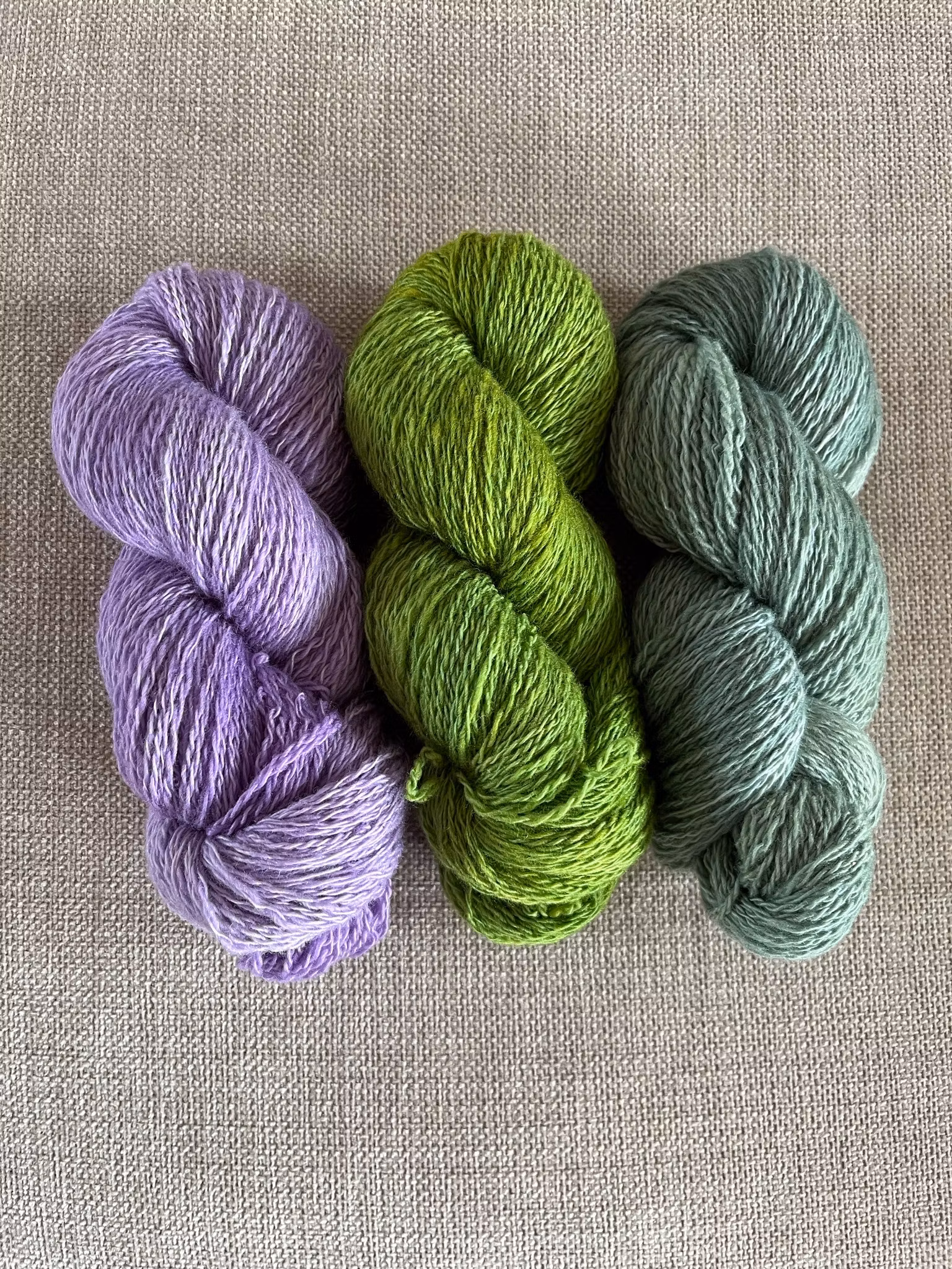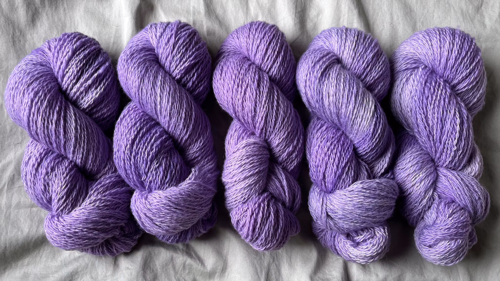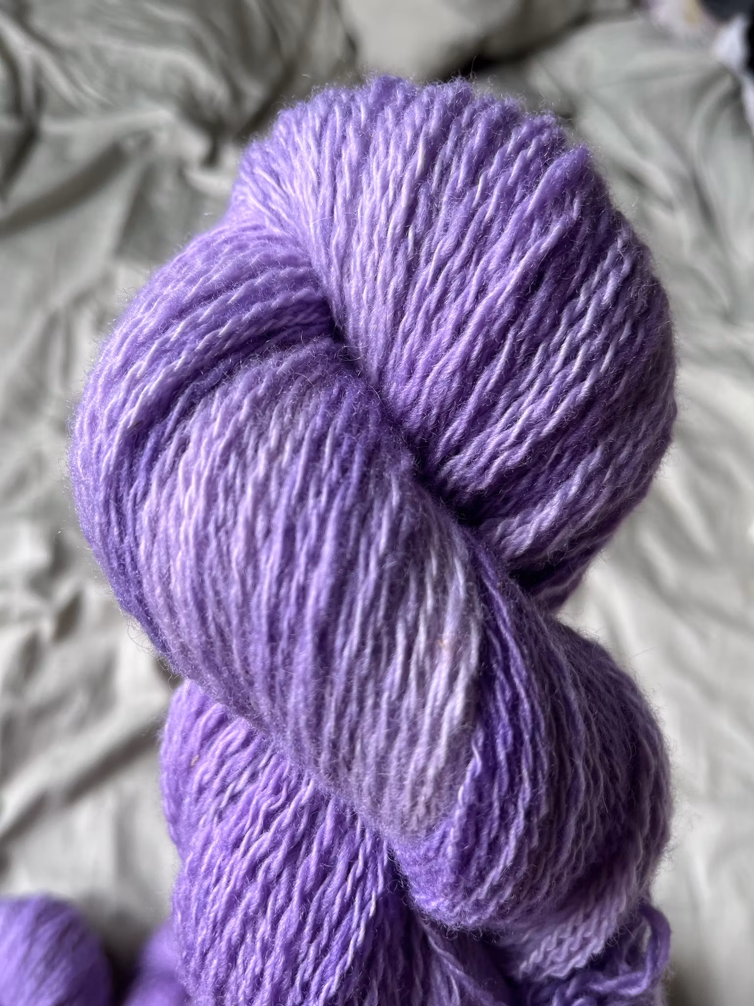Lila garn färgat på 100 % vit jämtlandsull. På bild nr 3 tillsammans med Ärtskott och Salvia.